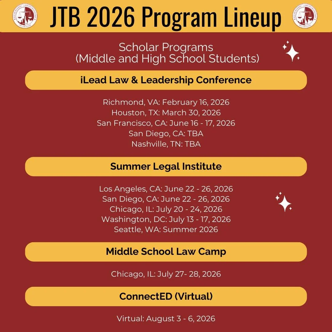 JTB educates hundreds of students about the legal profession through our school-year programs and Summer Legal Institutes (SLIs) around the country. These programs are all provided completely free of charge to the students we serve.